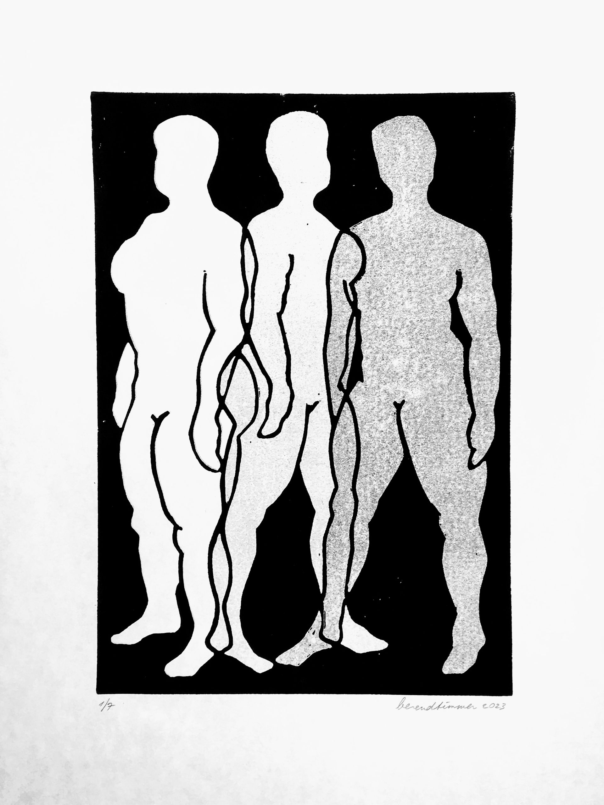 Nadat ik de (zeven) afdrukken afhad, zag ik dat pas dat de tekening een ernstige fout heeft: de armlengte van de vrouwen. Goed leerpunt om veel eerder te kijken of de tekening goed is.