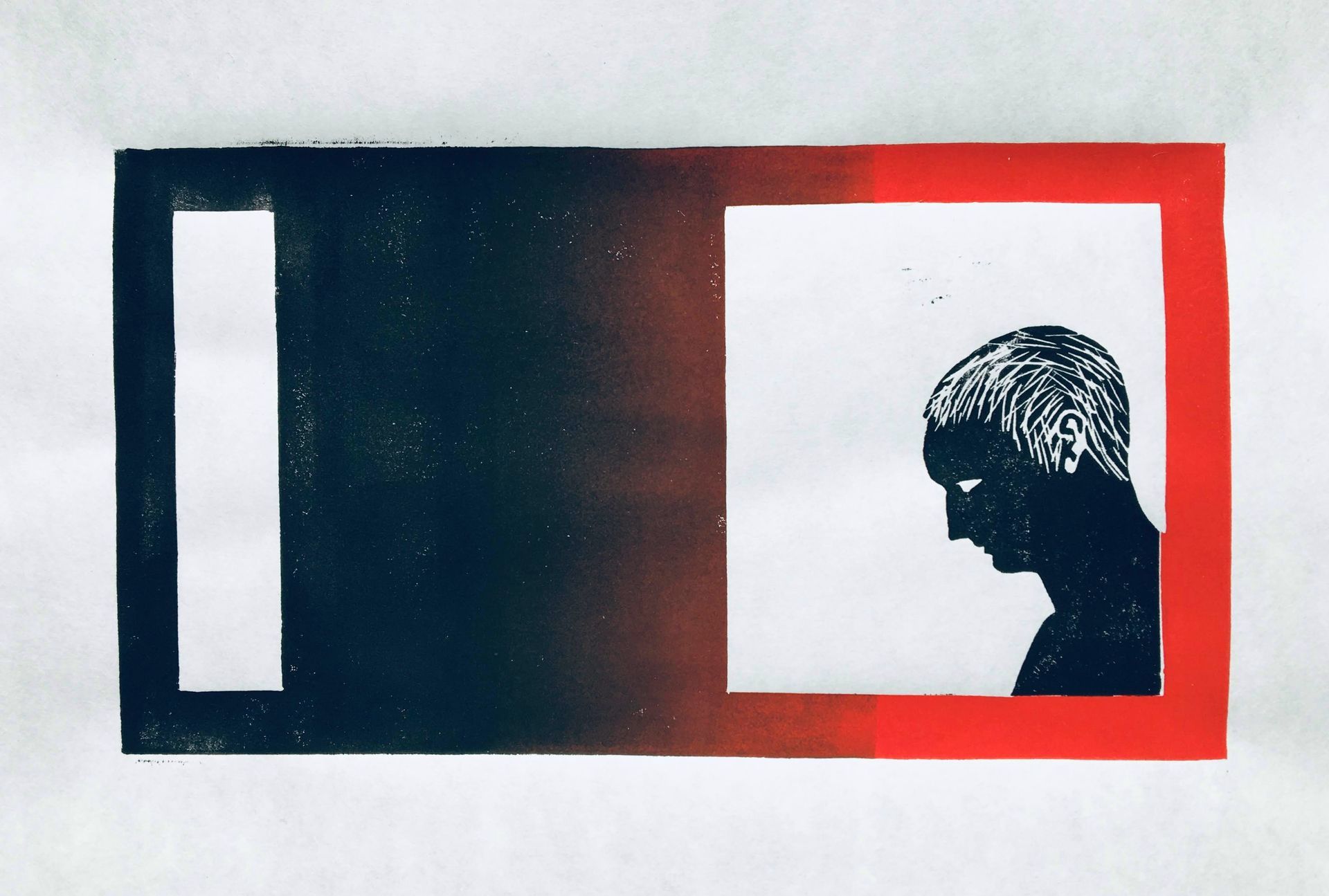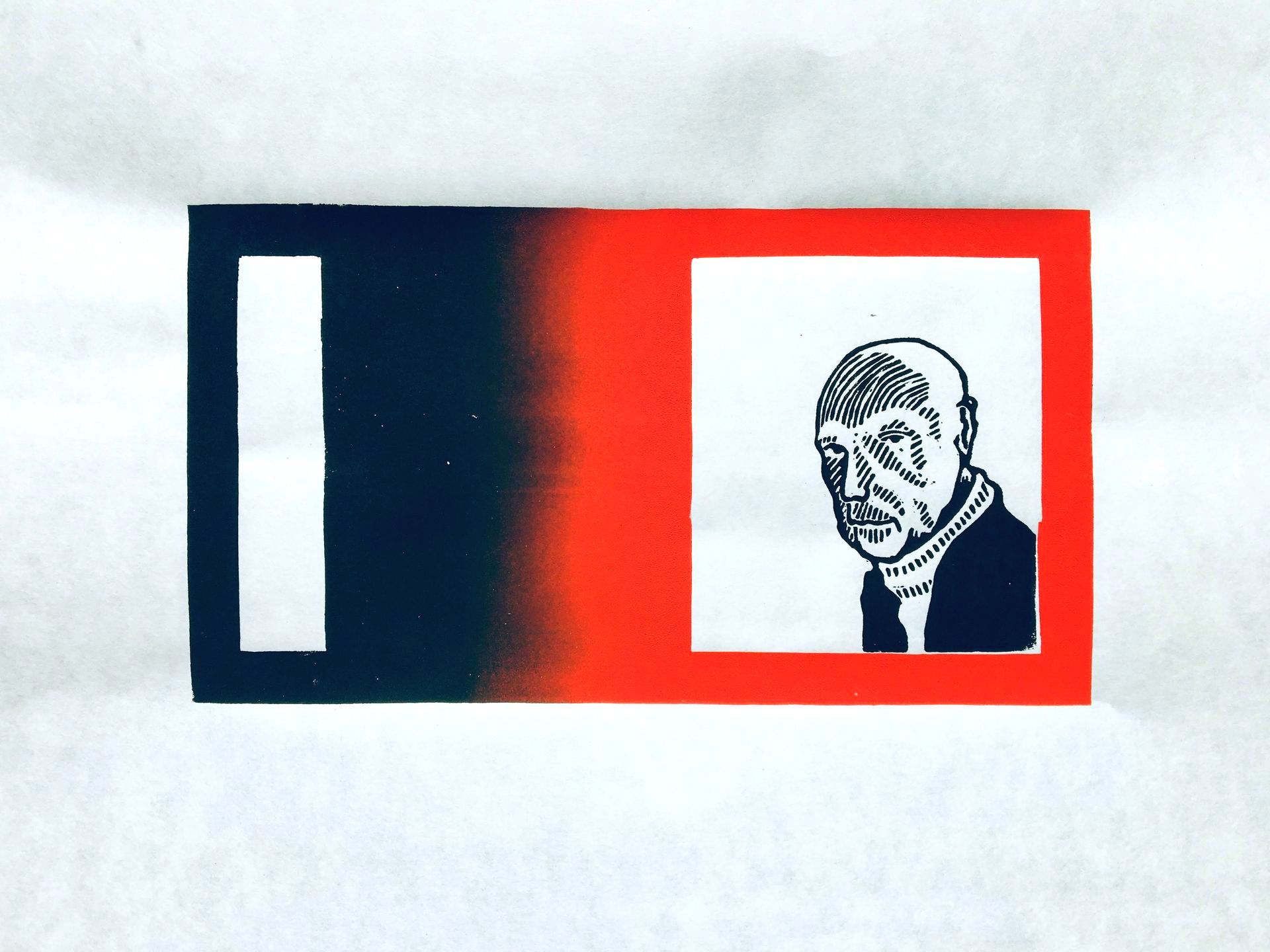 Eenvoudige weergave van iemand die in gedachten is. Bleek minder eenvoudig dan gedacht omdat ik de weergave van het oor mislukte. Om het nog een beetje te camoufleren voegde ik hoofdhaar toe. Daarna wat experimenteren met twee kleuren rood. Daarna het hoofd uit het frame verwijderd en vervangen door een portretje van mijn vader. Omdat een los onderdeel was van het linoleum kon ik ermee spelen. Ik gebruikte daarvoor courantpapier , wat me ook de vrijheid gaf om snel afdrukken te maken. Courantpapier is namelijk van geringe kwaliteit, niet duur en daarmee goed geschikt om wat uit te proberen.