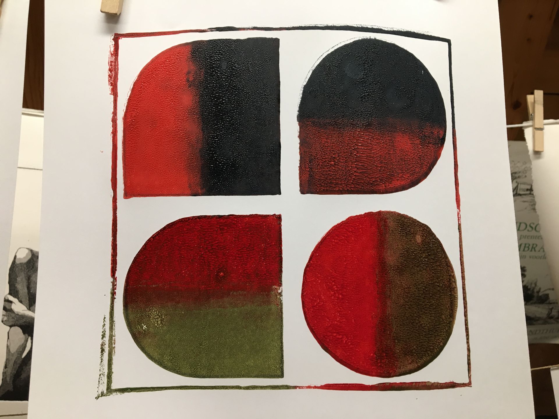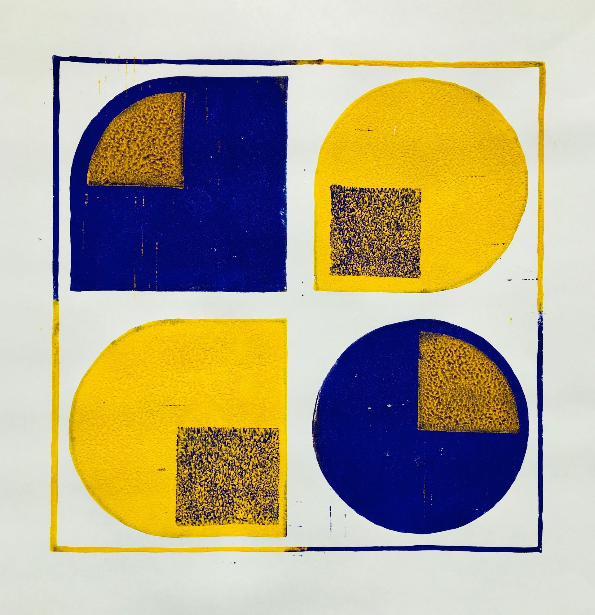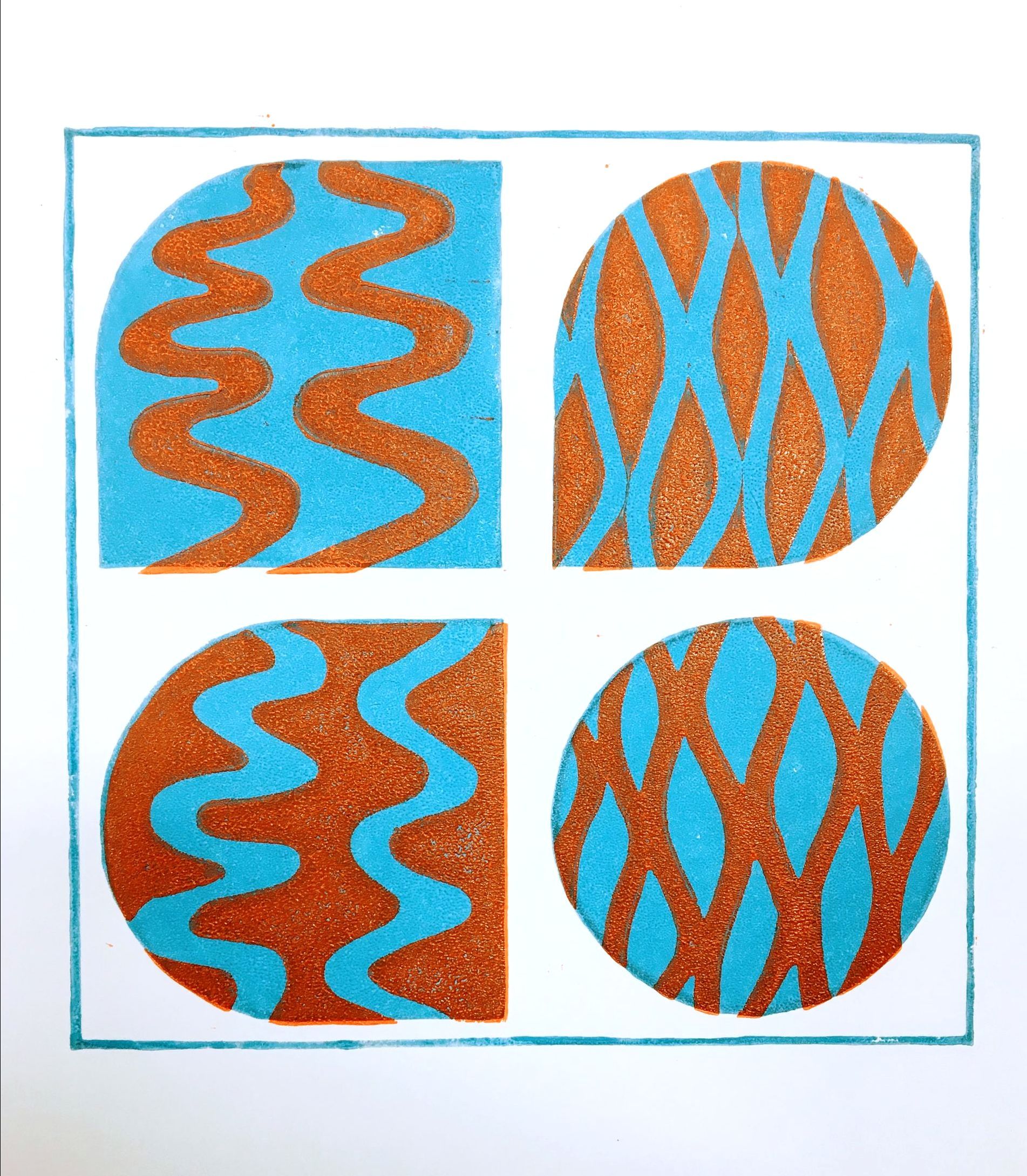 Twee lagen: (1) kader met achtergrond vier vormen, (2) tekening in de vormen. Verschillende oefeningen na elkaar: 'gewone' zwarte print, en wat experimenten met kleur. Nat op nat geeft extra effect.