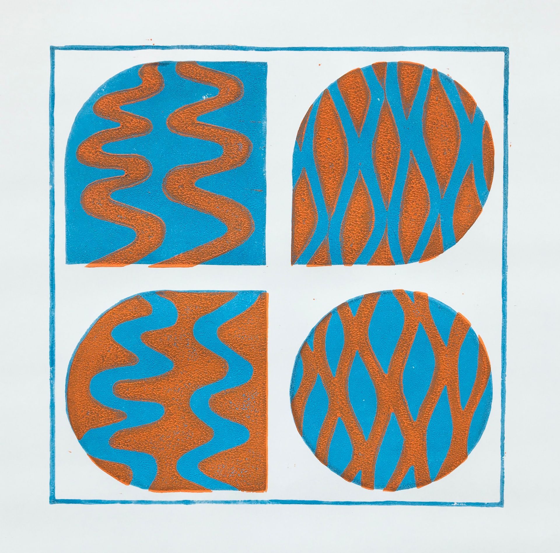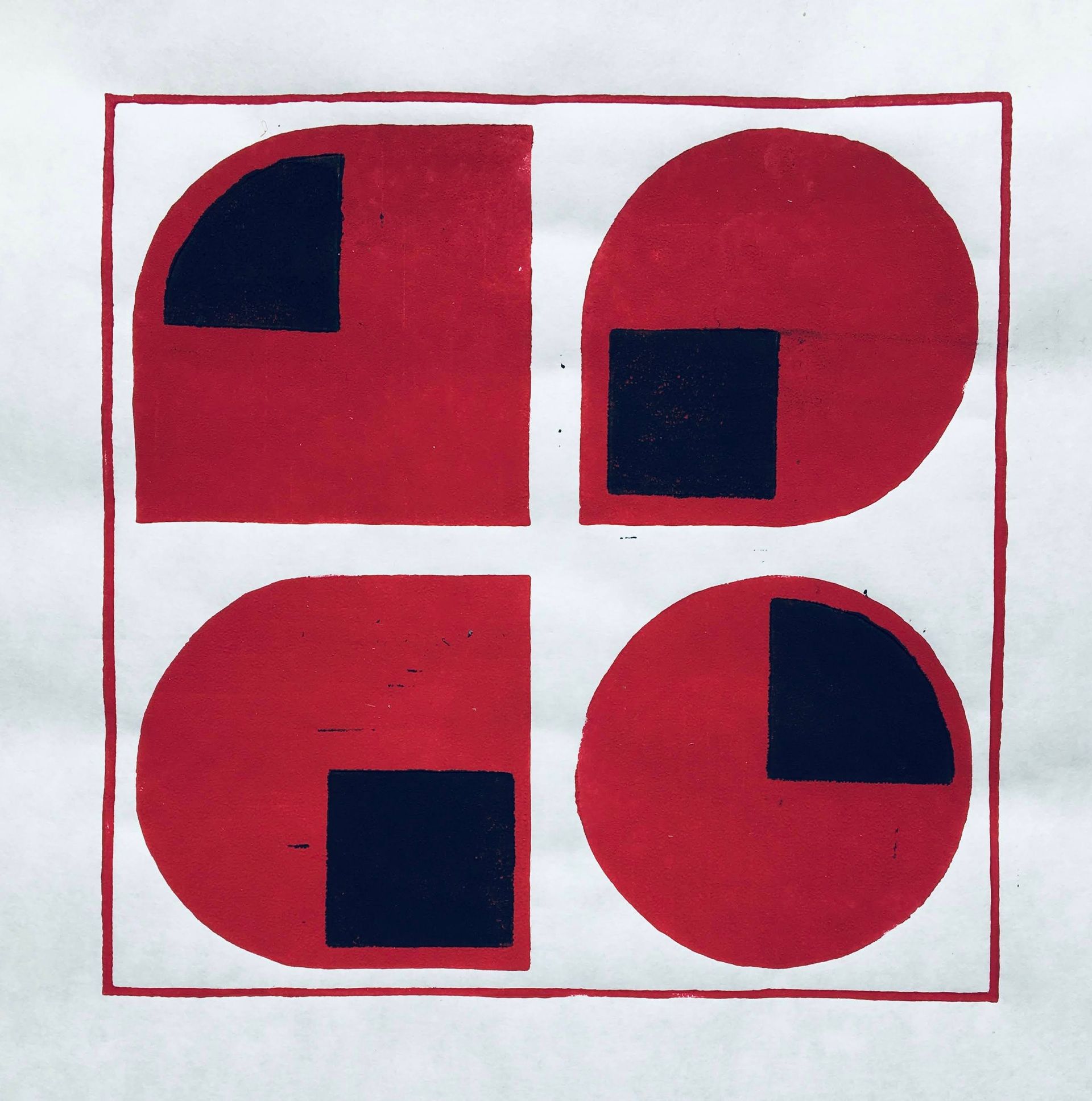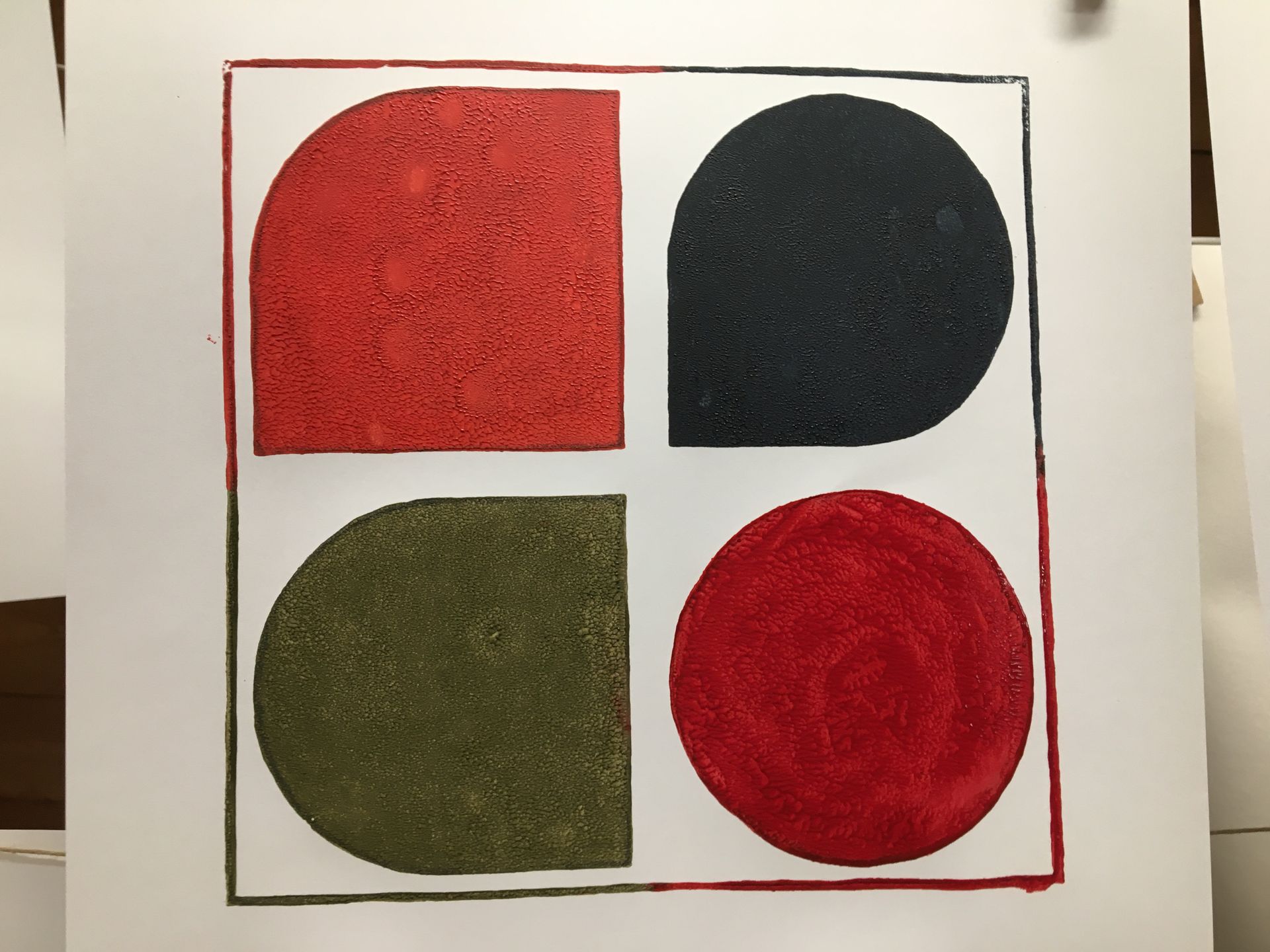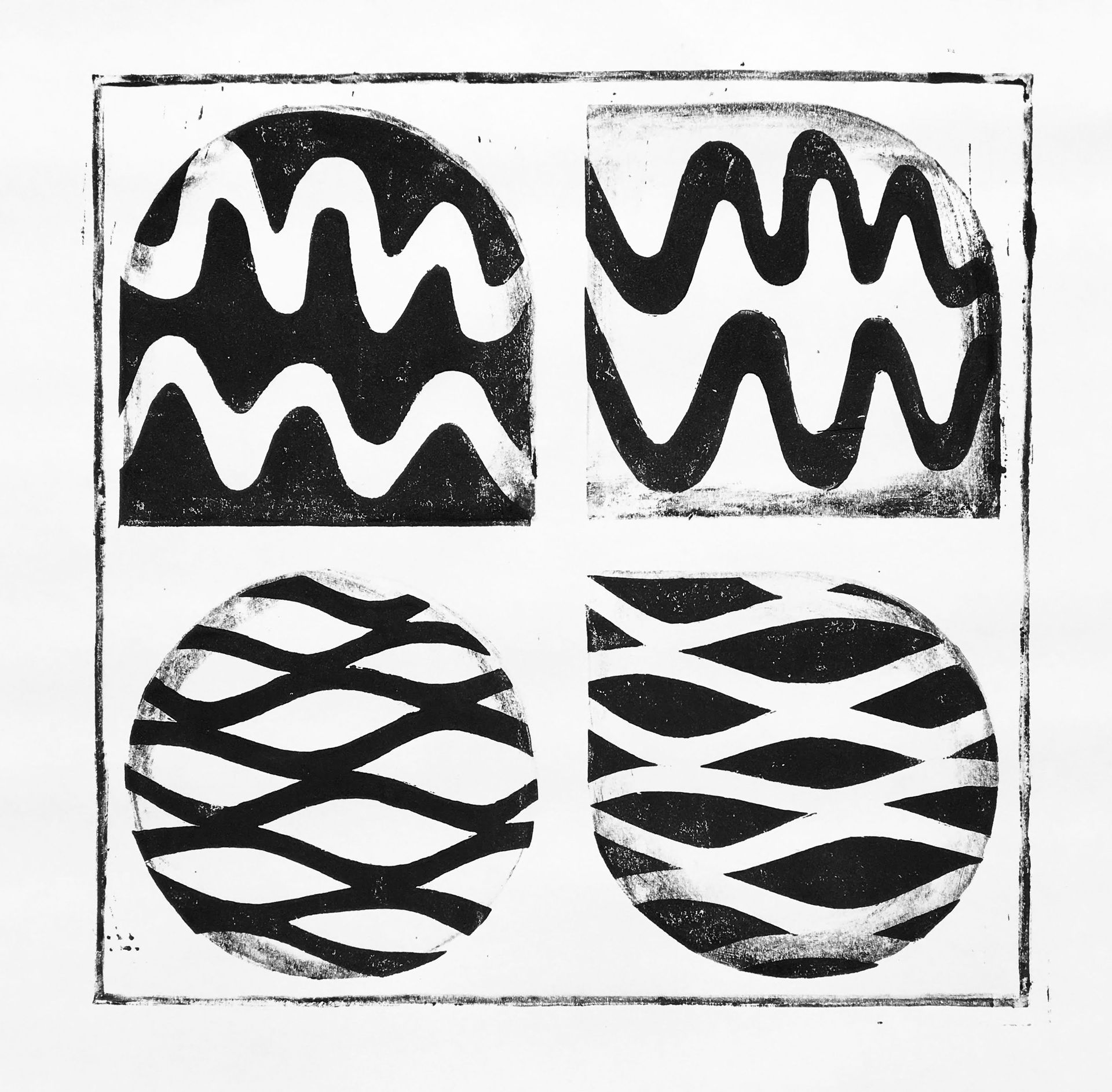 Twee lagen: (1) kader met achtergrond vier vormen, (2) tekening in de vormen. Verschillende oefeningen na elkaar: 'gewone' zwarte print, en wat experimenten met kleur. Nat op nat geeft extra effect.