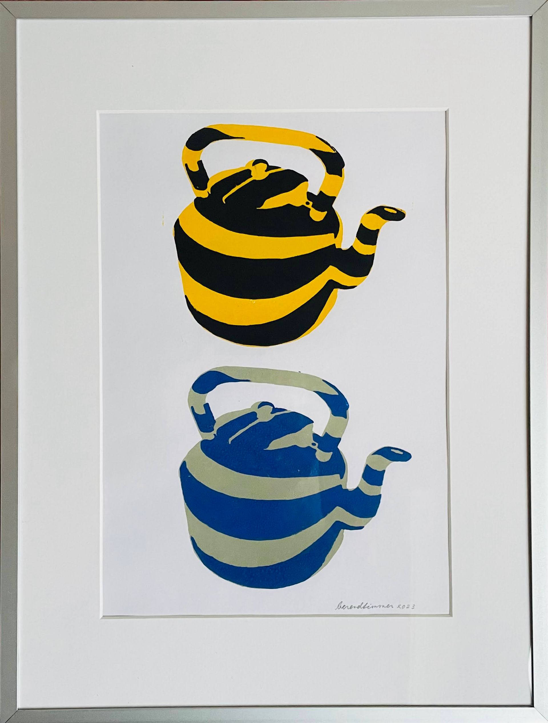 Het voordeel van de linodruk die uit meerdere aparte lagen bestaat, is dat je kunt experimenteren met kleurcombinaties. Om de waterketel enigszins dezelfde uitstraling te geven als de eerste van begin 2023, onderzocht ik verschillende kleurcombinaties. Spannend was vooral hoe het geel van invloed zou zijn op de kleur de daarbovenop wordt gedrukt. Dit is nauwelijks van te voren te beredeneren, dat moet je gewoon proberen.