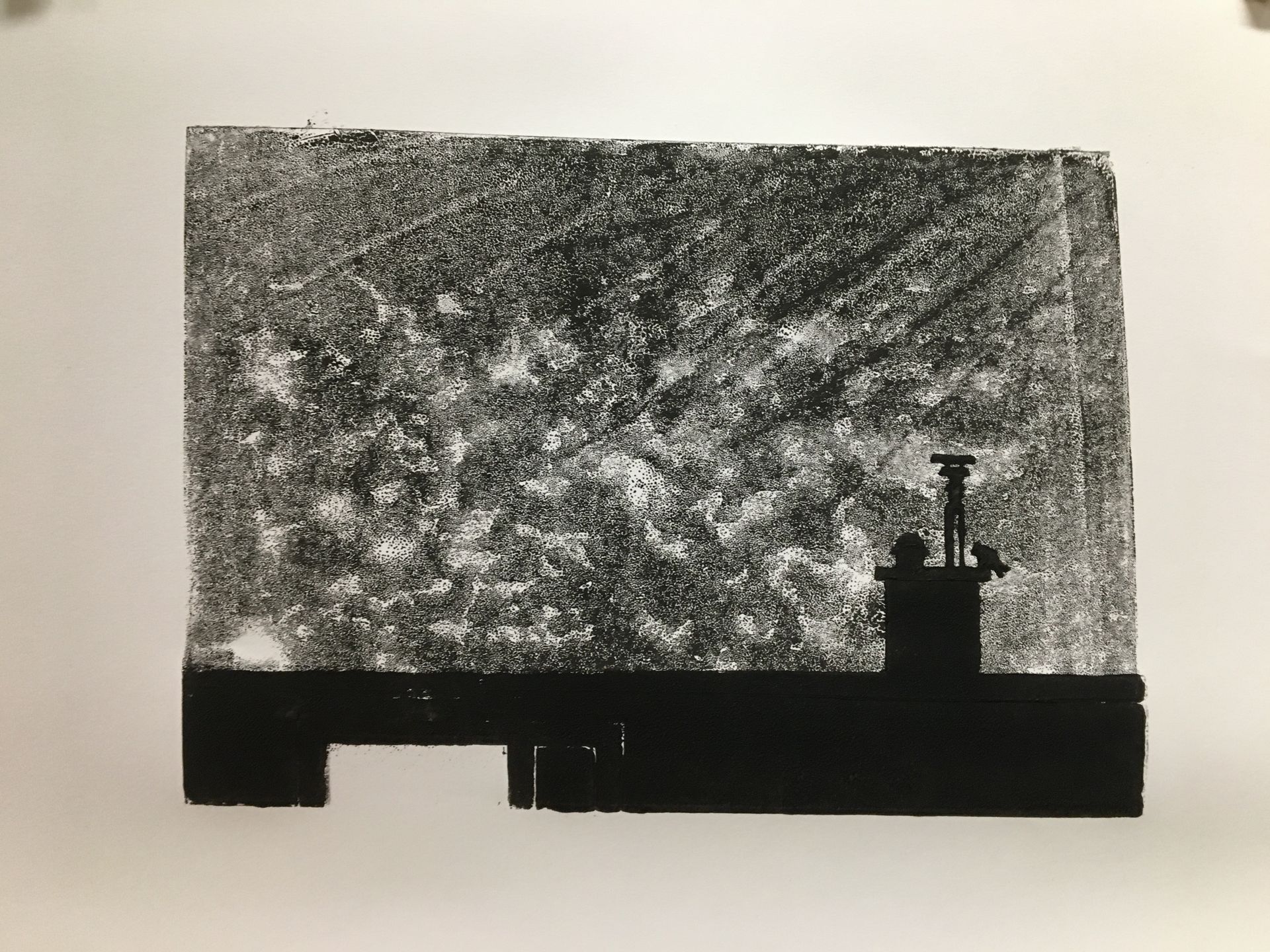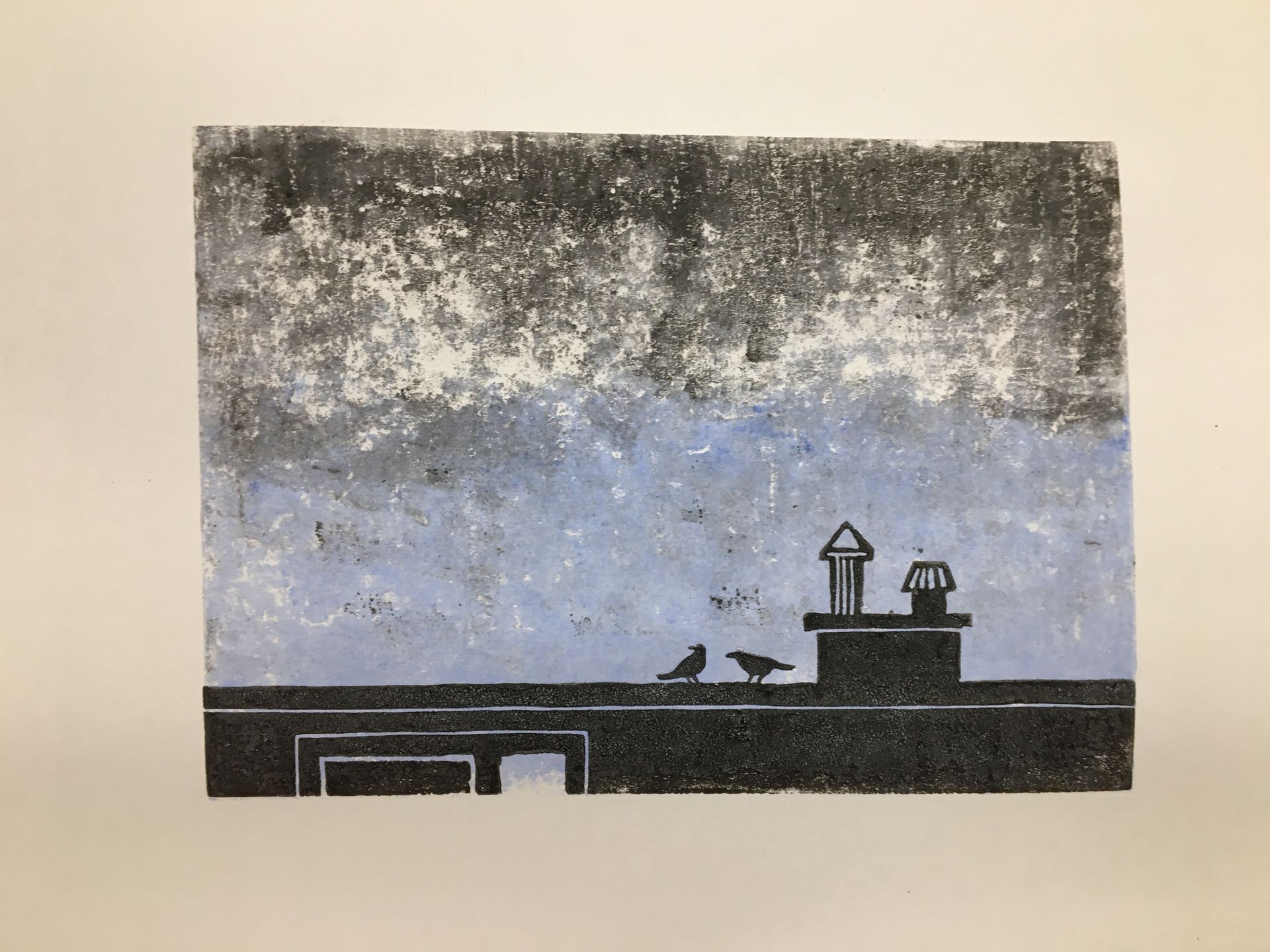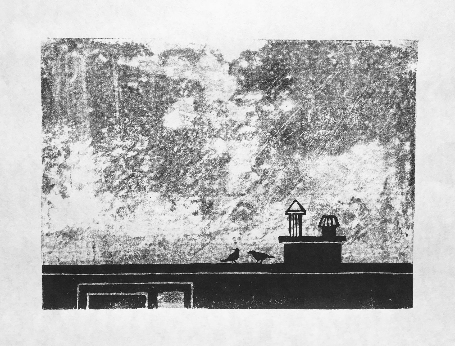 Een van de eerste oefeningen. Alleen de eerst in de serie is in een keer geprint, de anderen zijn in twee lagen. De eerste laag de lucht. Hoe kan met minder druk op het blad met inkt en met minder inkt het effect van wolken bereiken. En je kan er een kleur aan toevoegen. De tweede laag, het dak met schoorsteen en vogels, is 100% zwarte inkt.