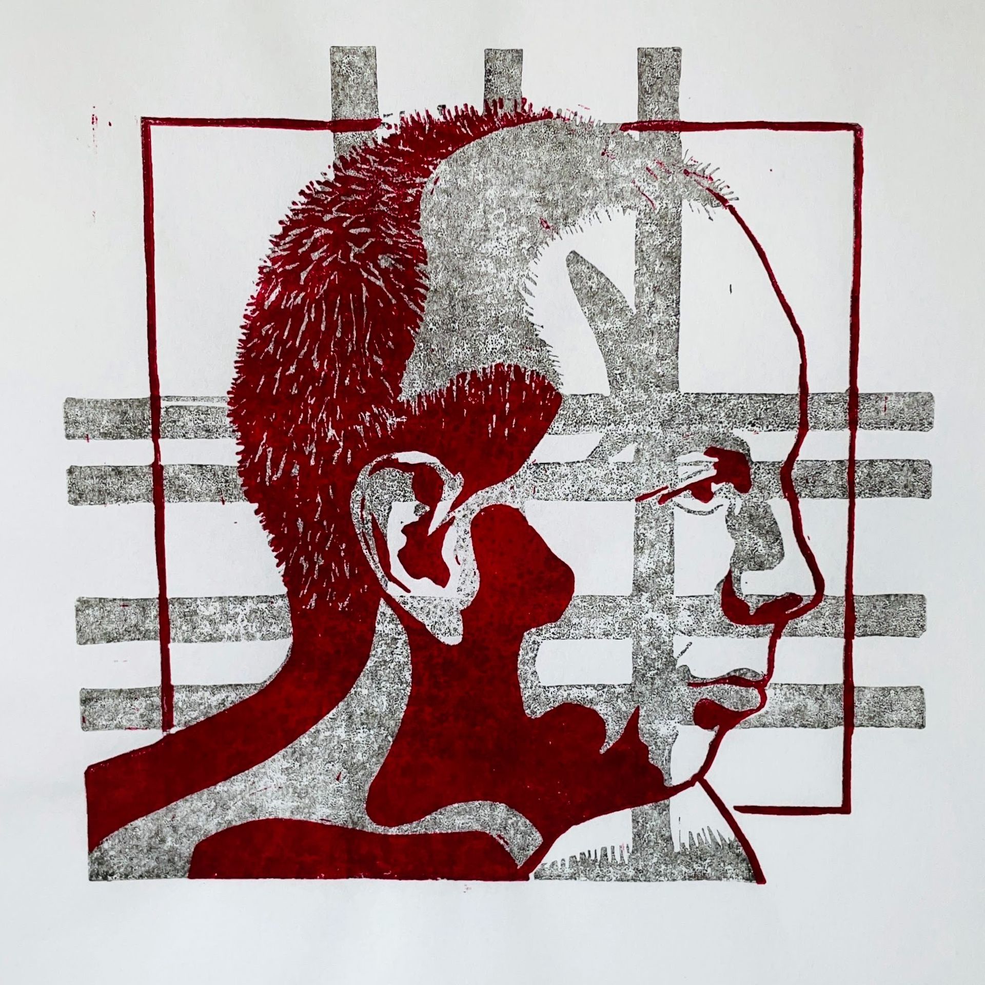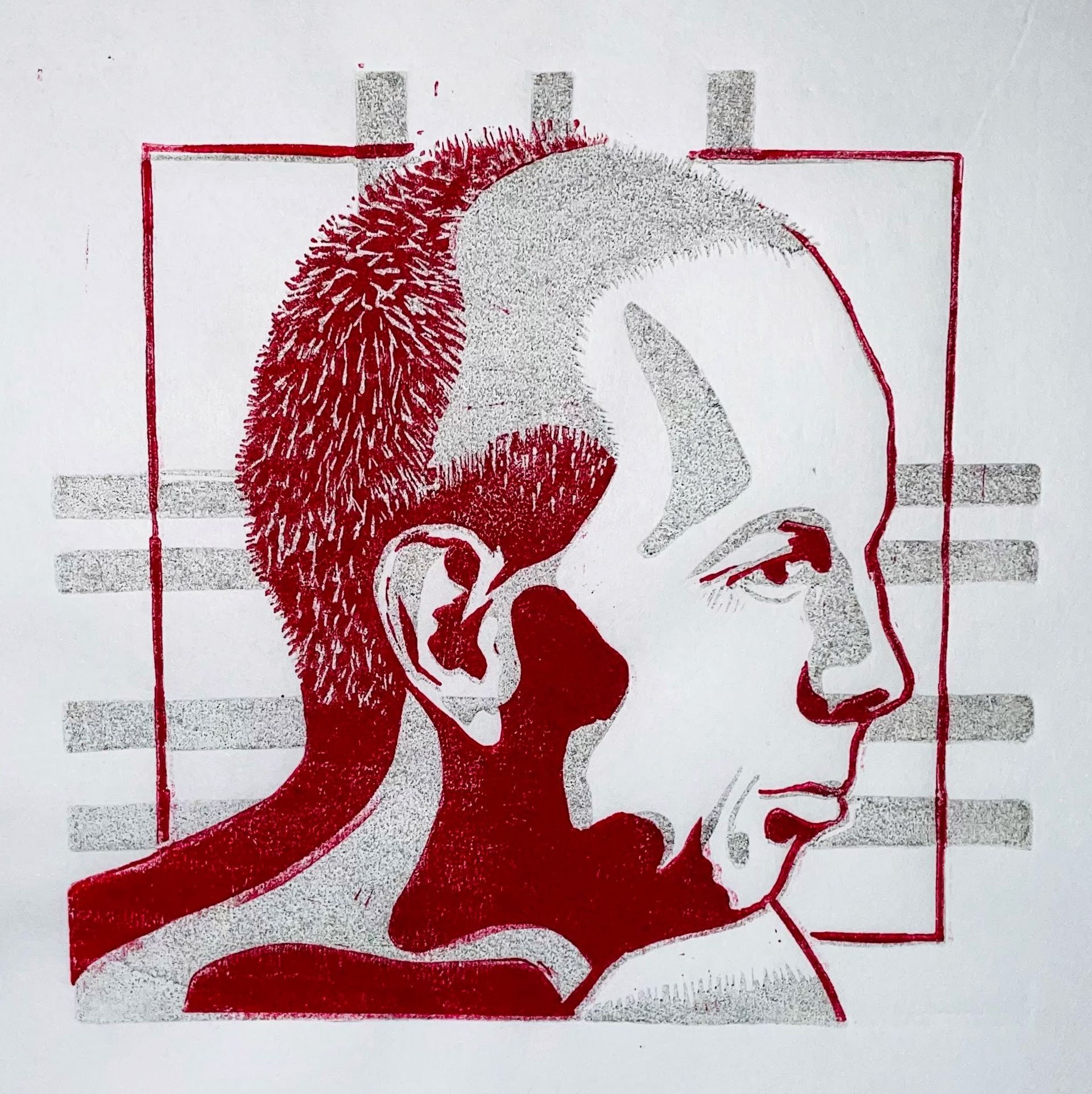 Al een tijdje probeer ik vat te krijgen op het tekenen van een hoofd. Hoe zijn de verhoudingen tussen mond, neus en ogen, waar precies moeten de oren geplaatst worden. Tekeninstructies reiken verhoudingen aan, waarmee je wat steun hebt bij het tekenen. Zo gezegd, zo gedaan. Dit bracht me ook het idee om de lijnen te gebruiken op de lino en daarmee op afdruk. Eerst met een grijstint, vervolgens met een extra kleur, rood in dit geval. Omdat de 'hulplijnen' te dominant waren, haalde ik ze weg. Van die versie maakte ik een paar afdrukken. Ik had er nog een over en probeerde daar nog eens rood op. En eigenlijk bevalt me die het best. Jammer genoeg verschoof het papier enigszins tijdens het afdrukken waardoor de print niet scherp is. Het is niet anders, gewoon beter opletten bij de volgende keer.